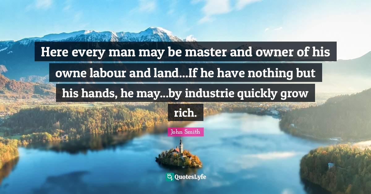 This page presents the quote "Here every man may be master and owner of his owne labour and land...If he have nothing but his hands, he may...by industrie quickly grow rich.". Author of this quote is John Smith. This quote is about men, may, rich, hands, every man, land, labour,.