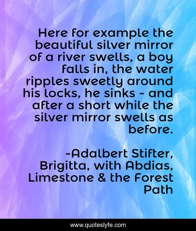 This page presents the quote "Here for example the beautiful silver mirror of a river swells, a boy falls in, the water ripples sweetly around his locks, he sinks - and after a short while the silver mirror swells as before.". Author of this quote is Adalbert Stifter, Brigitta, with Abdias, Limestone & the Forest Path. This quote is about water, abdias, drowning, nature,.