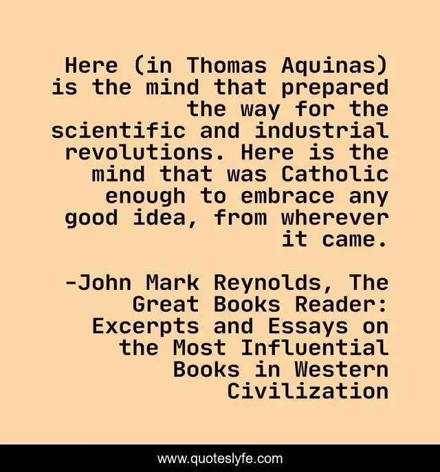 This page presents the quote "Here (in Thomas Aquinas) is the mind that prepared the way for the scientific and industrial revolutions. Here is the mind that was Catholic enough to embrace any good idea, from wherever it came.". Author of this quote is John Mark Reynolds, The Great Books Reader: Excerpts and Essays on the Most Influential Books in Western Civilization. This quote is about common-grace, technology, curiosity, theology,.