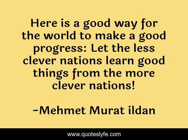 This page presents the quote "Here is a good way for the world to make a good progress: Let the less clever nations learn good things from the more clever nations!". Author of this quote is Mehmet Murat ildan. This quote is about turkish-aphorisms, clever, mehmet-murat-ildan, ildan-wise-sayings, turkish, ildan-wisdom, turkish-sayings, turkish-playwrights, nation,.