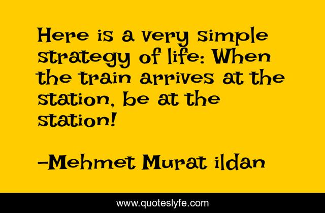 This page presents the quote "Here is a very simple strategy of life: When the train arrives at the station, be at the station!". Author of this quote is Mehmet Murat ildan. This quote is about life, ildan-words-of-wisdom, simple, train, life-and-sayings, station, strategy-for-life, life-strategy, strategy,.