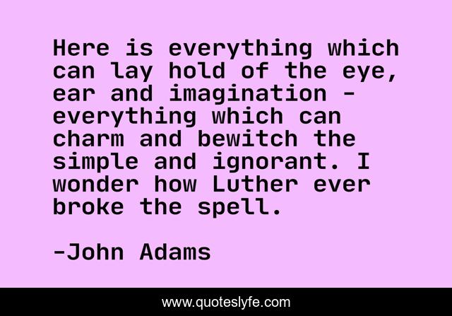 This page presents the quote "Here is everything which can lay hold of the eye, ear and imagination - everything which can charm and bewitch the simple and ignorant. I wonder how Luther ever broke the spell.". Author of this quote is John Adams. This quote is about simple, eye, ignorant,.