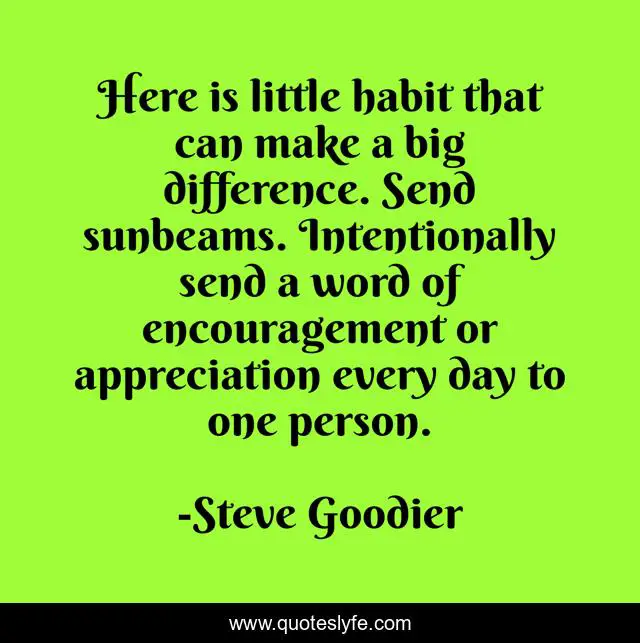 This page presents the quote "Here is little habit that can make a big difference. Send sunbeams. Intentionally send a word of encouragement or appreciation every day to one person.". Author of this quote is Steve Goodier. This quote is about encouragement, appreciation, affirmation, despair, encouraging-others, hope,.