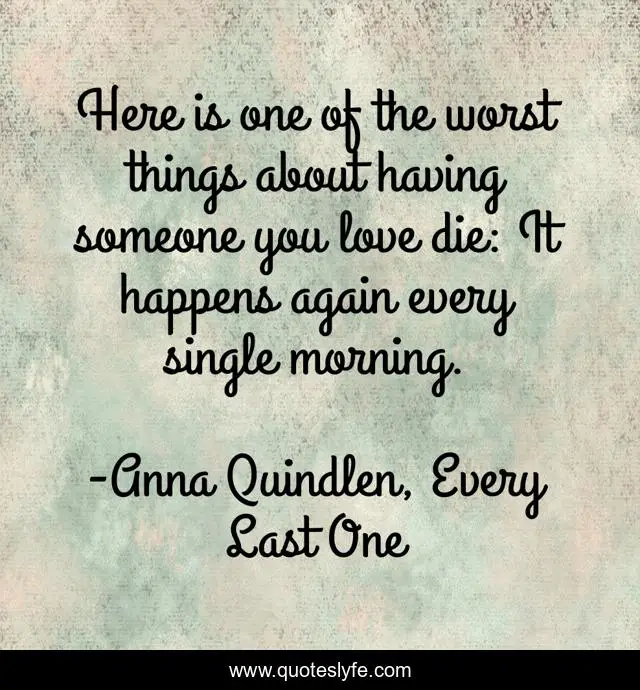 This page presents the quote "Here is one of the worst things about having someone you love die: It happens again every single morning.". Author of this quote is Anna Quindlen, Every Last One. This quote is about death, mourning,.