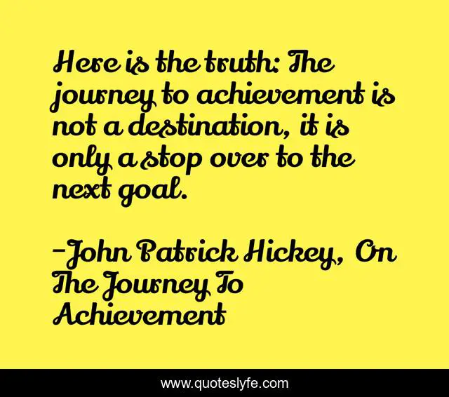 This page presents the quote "Here is the truth: The journey to achievement is not a destination, it is only a stop over to the next goal.". Author of this quote is John Patrick Hickey, On The Journey To Achievement. This quote is about success, personal-growth, achievement, goals, personal-development, goal-setting,.