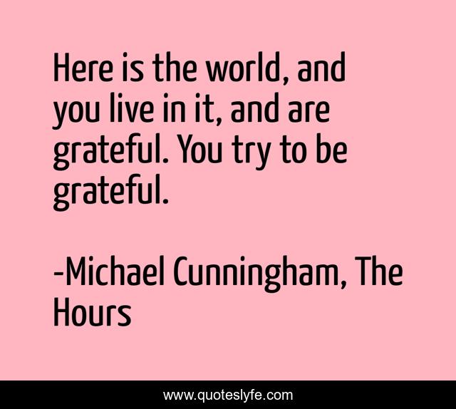 This page presents the quote "Here is the world, and you live in it, and are grateful. You try to be grateful.". Author of this quote is Michael Cunningham, The Hours. This quote is about gratitude, world, life, reflection,.
