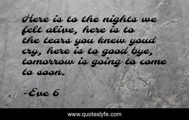 This page presents the quote "Here is to the nights we felt alive, here is to the tears you knew youd cry, here is to good bye, tomorrow is going to come to soon.". Author of this quote is Eve 6. This quote is about tears, goodbye,.
