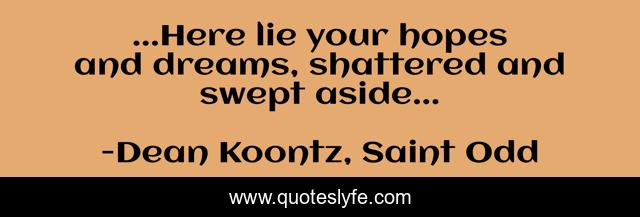 This page presents the quote "...Here lie your hopes and dreams, shattered and swept aside...". Author of this quote is Dean Koontz, Saint Odd. This quote is about shattered, glass, broken, burke-bailey-s, odd-thomas, hopes, dreams, stormy-llewellyn,.