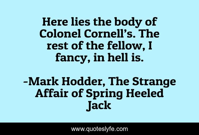 This page presents the quote "Here lies the body of Colonel Cornell’s. The rest of the fellow, I fancy, in hell is.". Author of this quote is Mark Hodder, The Strange Affair of Spring Heeled Jack. This quote is about mystery, steampunk, science-fiction,.