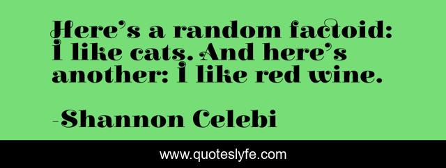 This page presents the quote "Here’s a random factoid: I like cats. And here’s another: I like red wine.". Author of this quote is Shannon Celebi. This quote is about cat, cats, red-wine, wine,.