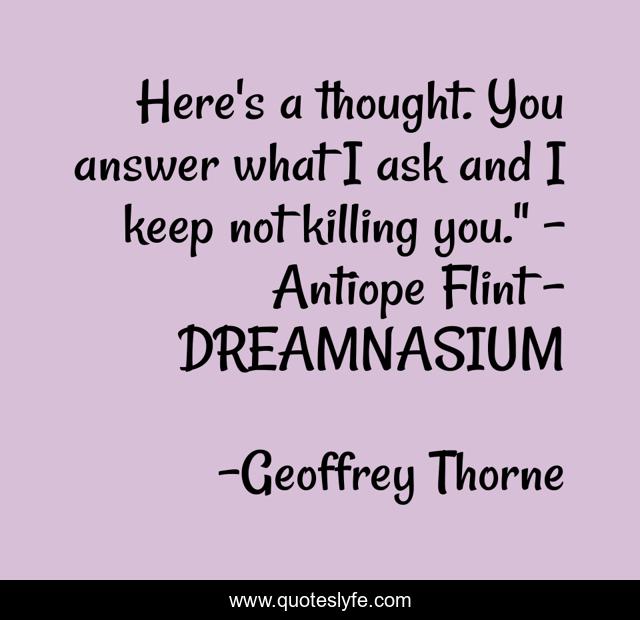 This page presents the quote "Here's a thought. You answer what I ask and I keep not killing you." - Antiope Flint - DREAMNASIUM". Author of this quote is Geoffrey Thorne. This quote is about action, fantasy, pulp-fiction, science-fiction,.
