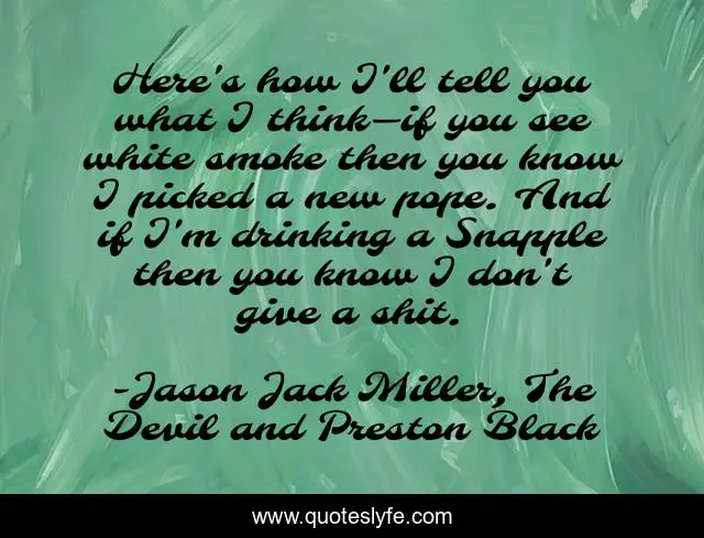 This page presents the quote "Here's how I'll tell you what I think—if you see white smoke then you know I picked a new pope. And if I'm drinking a Snapple then you know I don't give a shit.". Author of this quote is Jason Jack Miller, The Devil and Preston Black. This quote is about jason-jack-miller, appalachia, supernatural, murder-ballads-and-whiskey, deal-with-the-devil, the-devil-and-preston-black, appalachian-fiction,.