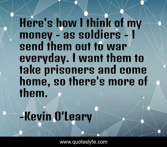 This page presents the quote "Here's how I think of my money - as soldiers - I send them out to war everyday. I want them to take prisoners and come home, so there's more of them.". Author of this quote is Kevin O'Leary. This quote is about home, money,.