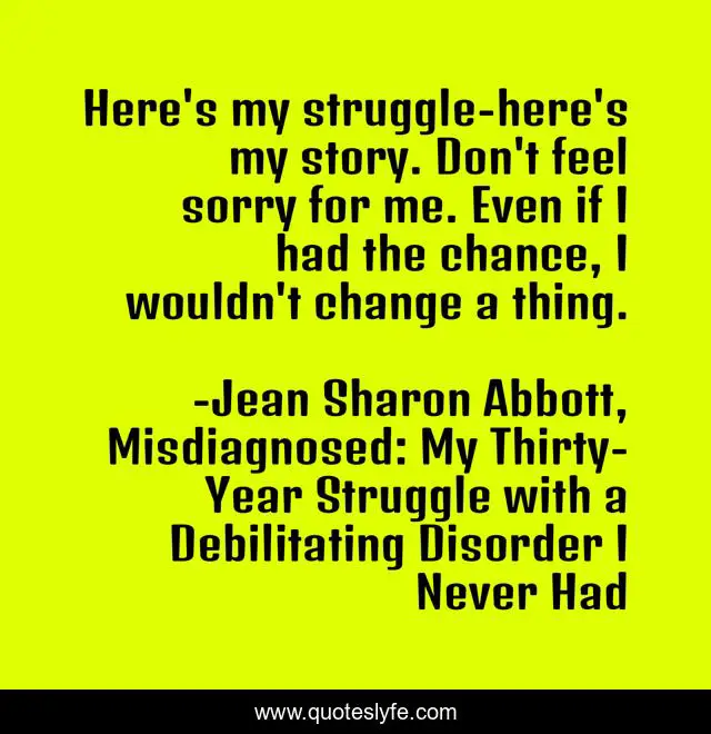 This page presents the quote "Here's my struggle-here's my story. Don't feel sorry for me. Even if I had the chance, I wouldn't change a thing.". Author of this quote is Jean Sharon Abbott, Misdiagnosed: My Thirty-Year Struggle with a Debilitating Disorder I Never Had. .