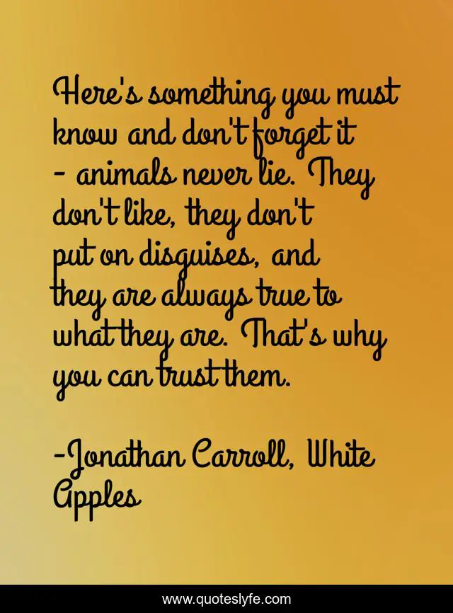 This page presents the quote "Here's something you must know and don't forget it - animals never lie. They don't like, they don't put on disguises, and they are always true to what they are. That's why you can trust them.". Author of this quote is Jonathan Carroll, White Apples. .