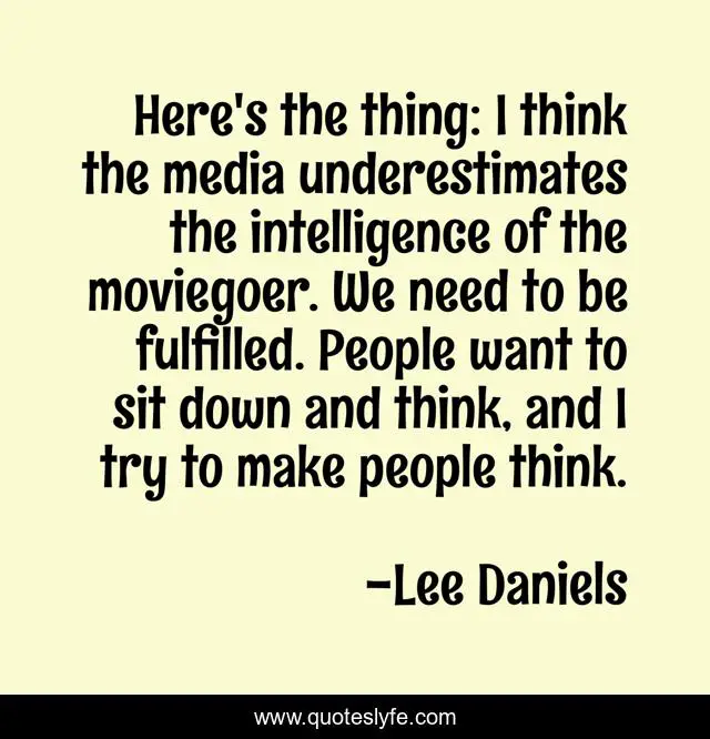 This page presents the quote "Here's the thing: I think the media underestimates the intelligence of the moviegoer. We need to be fulfilled. People want to sit down and think, and I try to make people think.". Author of this quote is Lee Daniels. This quote is about media, people,.