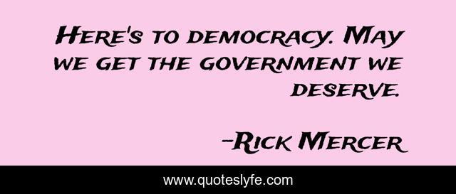 This page presents the quote "Here's to democracy. May we get the government we deserve.". Author of this quote is Rick Mercer. This quote is about deserve, democracy, here,.