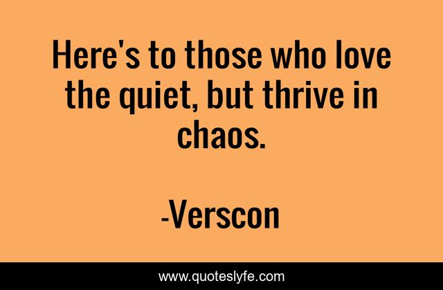 This page presents the quote "Here's to those who love the quiet, but thrive in chaos.". Author of this quote is Verscon. This quote is about life, chaos, thrive, quiet,.