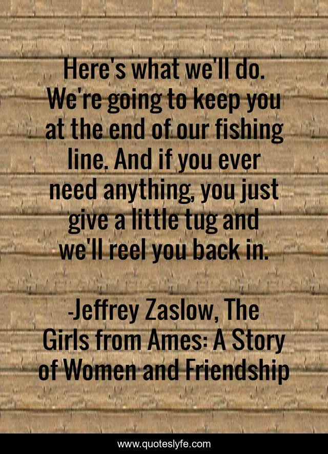 This page presents the quote "Here's what we'll do. We're going to keep you at the end of our fishing line. And if you ever need anything, you just give a little tug and we'll reel you back in.". Author of this quote is Jeffrey Zaslow, The Girls from Ames: A Story of Women and Friendship. .