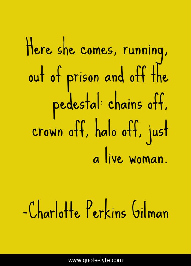 This page presents the quote "Here she comes, running, out of prison and off the pedestal: chains off, crown off, halo off, just a live woman.". Author of this quote is Charlotte Perkins Gilman. .