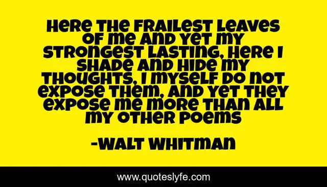This page presents the quote "Here the frailest leaves of me and yet my strongest lasting, Here I shade and hide my thoughts, I myself do not expose them, And yet they expose me more than all my other poems". Author of this quote is Walt Whitman. .