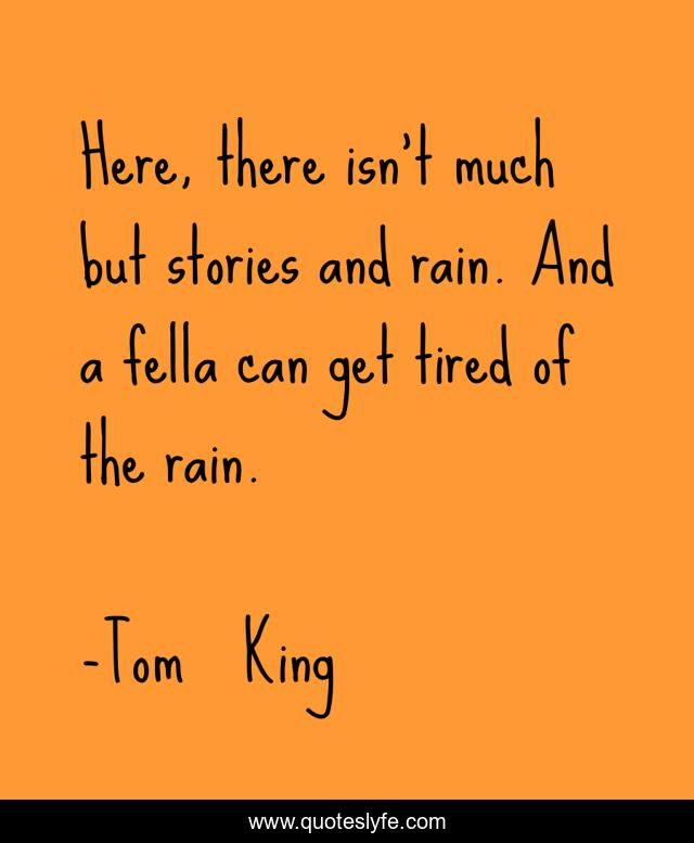 This page presents the quote "Here, there isn't much but stories and rain. And a fella can get tired of the rain.". Author of this quote is Tom King. This quote is about grayson, stories, rain,.