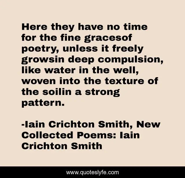 This page presents the quote "Here they have no time for the fine gracesof poetry, unless it freely growsin deep compulsion, like water in the well, woven into the texture of the soilin a strong pattern.". Author of this quote is Iain Crichton Smith, New Collected Poems: Iain Crichton Smith. This quote is about crichton-smith, poetry,.
