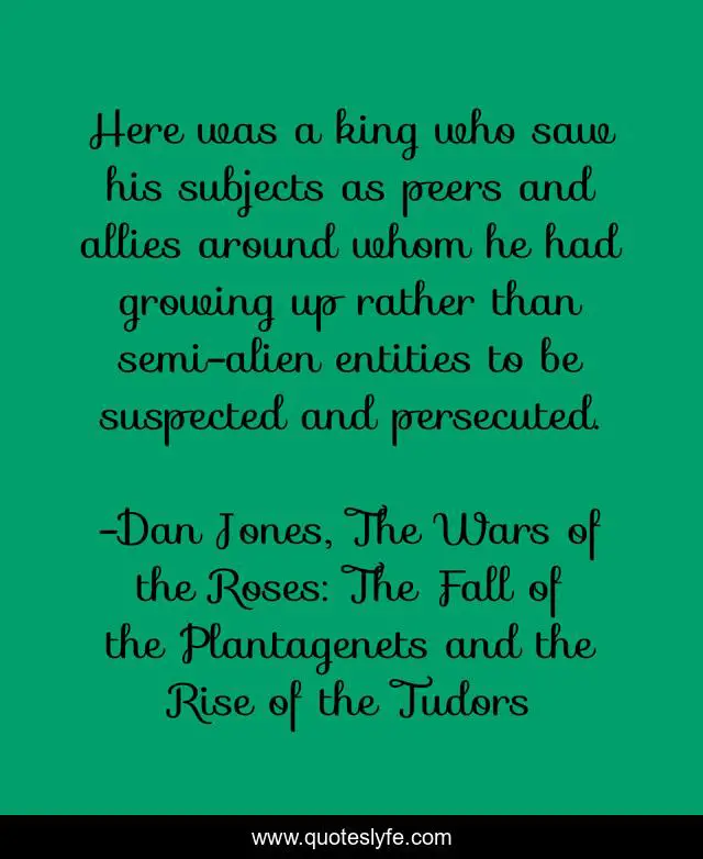 This page presents the quote "Here was a king who saw his subjects as peers and allies around whom he had growing up rather than semi-alien entities to be suspected and persecuted.". Author of this quote is Dan Jones, The Wars of the Roses: The Fall of the Plantagenets and the Rise of the Tudors. This quote is about and-culture, education, acculturation, culture,.