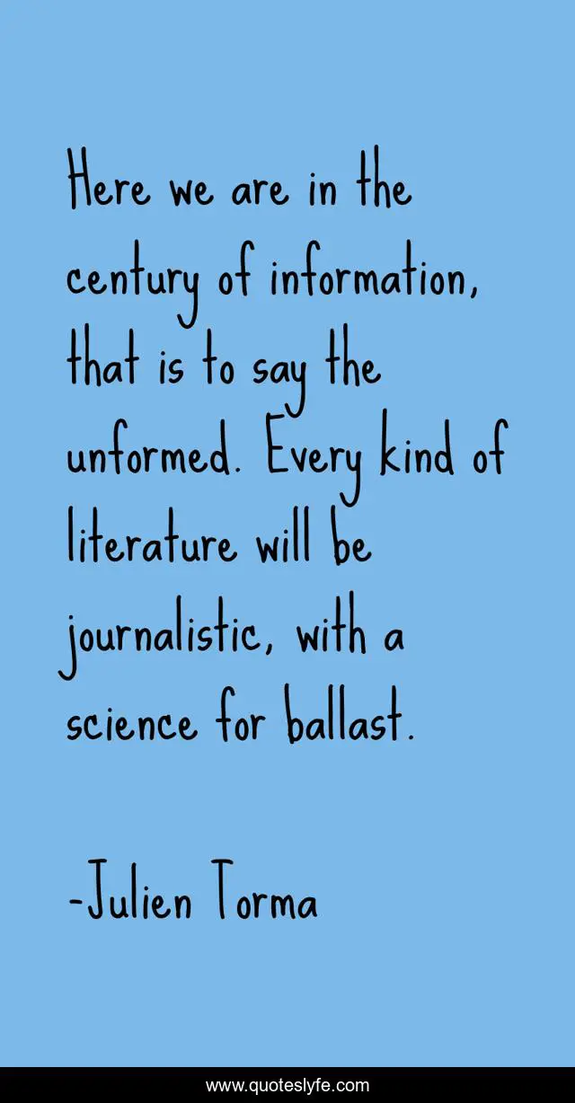 This page presents the quote "Here we are in the century of information, that is to say the unformed. Every kind of literature will be journalistic, with a science for ballast.". Author of this quote is Julien Torma. This quote is about literature, information-age, journalism, euphorisms, prescient, postmodern,.
