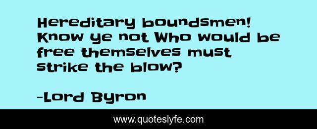 This page presents the quote "Hereditary boundsmen! Know ye not Who would be free themselves must strike the blow?". Author of this quote is Lord Byron. .