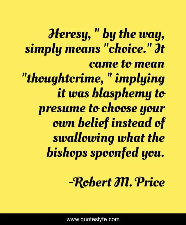 This page presents the quote "Heresy, " by the way, simply means "choice." It came to mean "thoughtcrime, " implying it was blasphemy to presume to choose your own belief instead of swallowing what the bishops spoonfed you.". Author of this quote is Robert M. Price. This quote is about blasphemy, heresy, choice,.