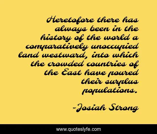 This page presents the quote "Heretofore there has always been in the history of the world a comparatively unoccupied land westward, into which the crowded countries of the East have poured their surplus populations.". Author of this quote is Josiah Strong. This quote is about world, land, always,.