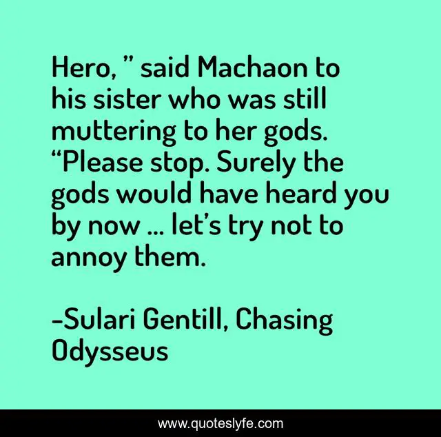 This page presents the quote "Hero, ” said Machaon to his sister who was still muttering to her gods. “Please stop. Surely the gods would have heard you by now … let’s try not to annoy them.". Author of this quote is Sulari Gentill, Chasing Odysseus. This quote is about annoy, hero, greek-myths, gods, stop, greek-gods, trojan-war, greek, greeks,.