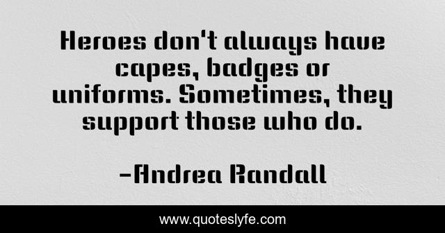 This page presents the quote "Heroes don't always have capes, badges or uniforms. Sometimes, they support those who do.". Author of this quote is Andrea Randall. This quote is about andrea-randall, hero, support, uniform, heroism, cape, badge,.