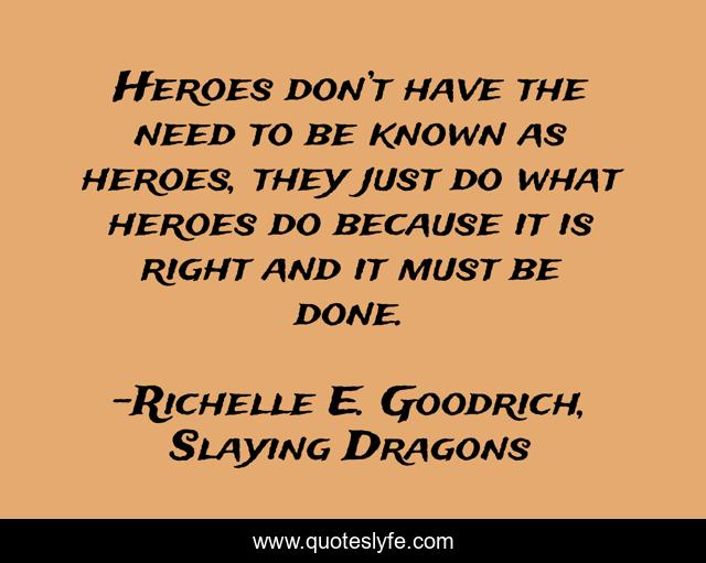 This page presents the quote "Heroes don’t have the need to be known as heroes, they just do what heroes do because it is right and it must be done.". Author of this quote is Richelle E. Goodrich, Slaying Dragons. This quote is about hero, richelle-e-goodrich, do-what-is-right, heroism, richelle, richelle-goodrich, heroes, do-what-must-be-done,.