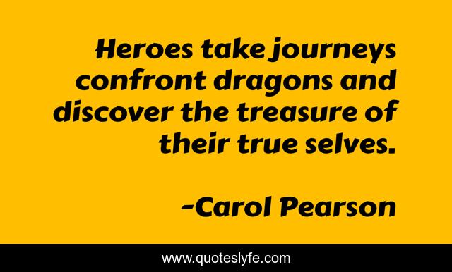 This page presents the quote "Heroes take journeys confront dragons and discover the treasure of their true selves.". Author of this quote is Carol Pearson. This quote is about positive, confidence, creating, change,.
