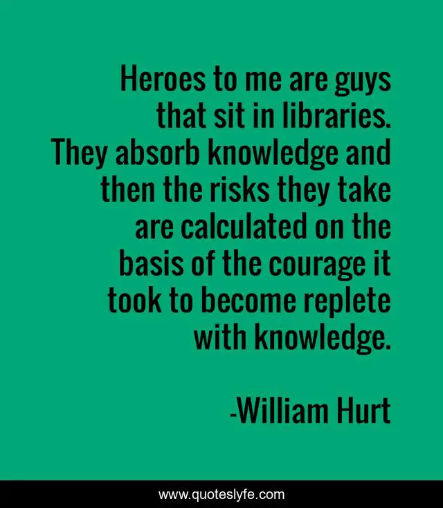 This page presents the quote "Heroes to me are guys that sit in libraries. They absorb knowledge and then the risks they take are calculated on the basis of the courage it took to become replete with knowledge.". Author of this quote is William Hurt. This quote is about me, knowledge, risks,.
