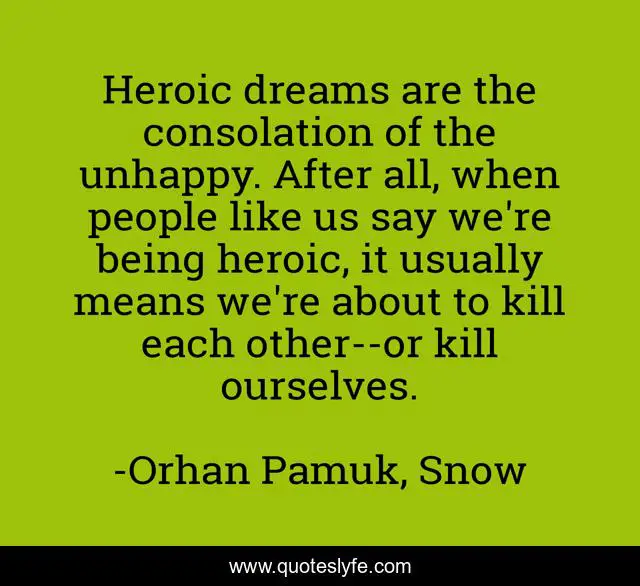 This page presents the quote "Heroic dreams are the consolation of the unhappy. After all, when people like us say we're being heroic, it usually means we're about to kill each other--or kill ourselves.". Author of this quote is Orhan Pamuk, Snow. This quote is about heroes, heroics, heroism, orhan-pamuk, snow,.