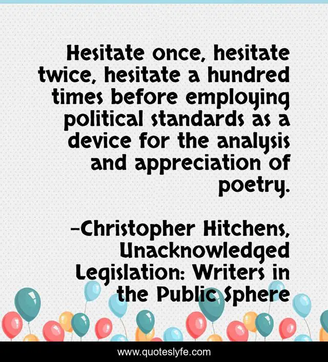 This page presents the quote "Hesitate once, hesitate twice, hesitate a hundred times before employing political standards as a device for the analysis and appreciation of poetry.". Author of this quote is Christopher Hitchens, Unacknowledged Legislation: Writers in the Public Sphere. This quote is about anthony-julius, politics, poetry, ts-eliot,.