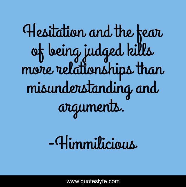 This page presents the quote "Hesitation and the fear of being judged kills more relationships than misunderstanding and arguments.". Author of this quote is Himmilicious. This quote is about judgement, hesitation, argument, relationship,.