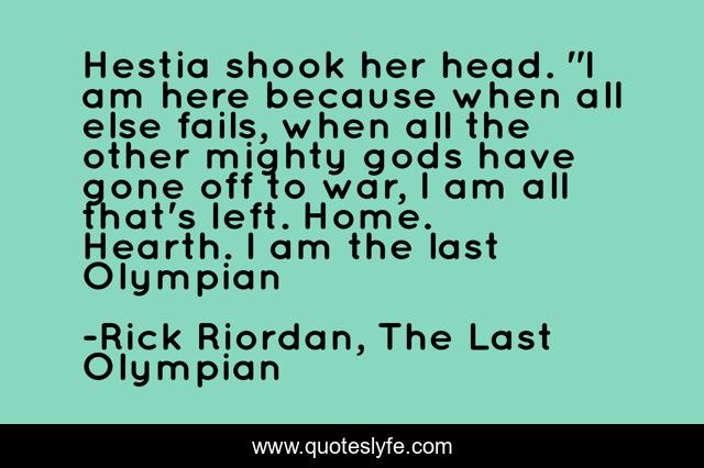This page presents the quote "Hestia shook her head. "I am here because when all else fails, when all the other mighty gods have gone off to war, I am all that's left. Home. Hearth. I am the last Olympian". Author of this quote is Rick Riordan, The Last Olympian. This quote is about hestia, percy-jackson,.