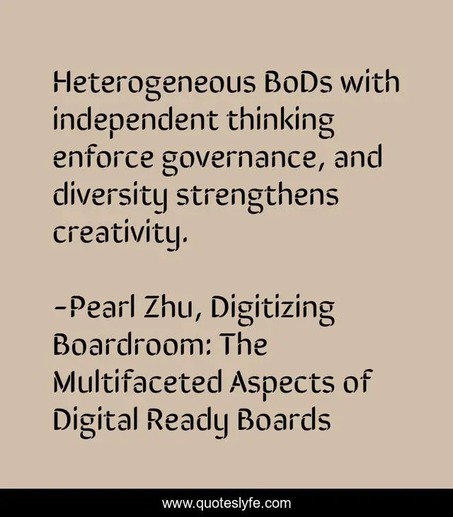 This page presents the quote "Heterogeneous BoDs with independent thinking enforce governance, and diversity strengthens creativity.". Author of this quote is Pearl Zhu, Digitizing Boardroom: The Multifaceted Aspects of Digital Ready Boards. This quote is about board-of-directors, creativity, boards, independent-thinking,.