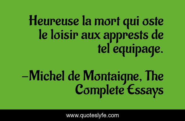 This page presents the quote "Heureuse la mort qui oste le loisir aux apprests de tel equipage.". Author of this quote is Michel de Montaigne, The Complete Essays. This quote is about essay, renaissance, skepticism, philosophy, french,.
