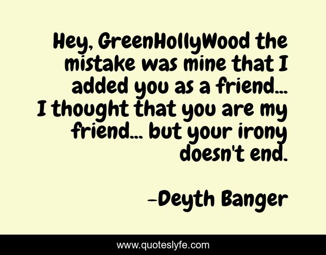 This page presents the quote "Hey, GreenHollyWood the mistake was mine that I added you as a friend... I thought that you are my friend... but your irony doesn't end.". Author of this quote is Deyth Banger. This quote is about irony, character, feature, friendship, friend, mistake,.