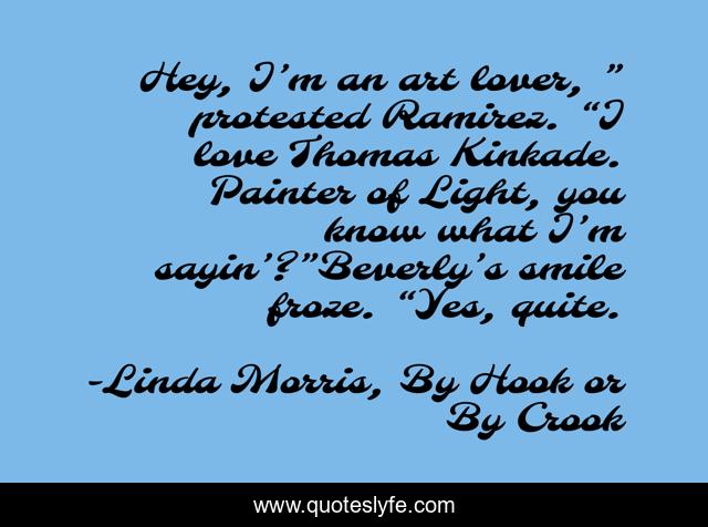 This page presents the quote "Hey, I’m an art lover, ” protested Ramirez. “I love Thomas Kinkade. Painter of Light, you know what I’m sayin’?”Beverly’s smile froze. “Yes, quite.". Author of this quote is Linda Morris, By Hook or By Crook. .