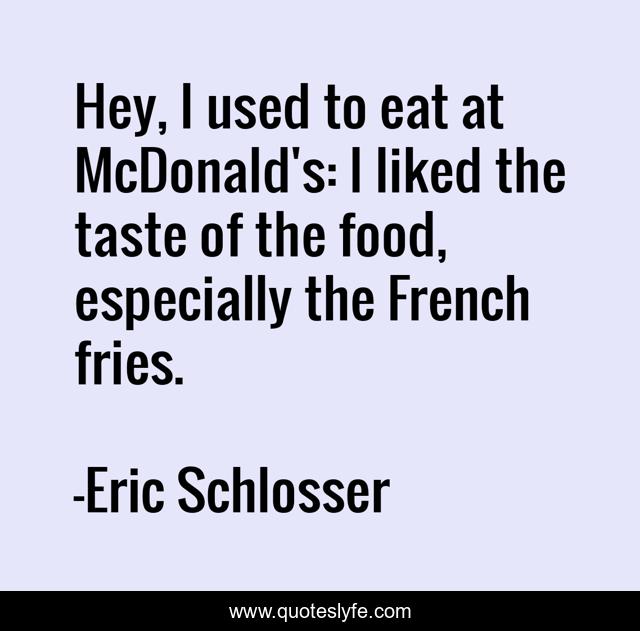 This page presents the quote "Hey, I used to eat at McDonald's: I liked the taste of the food, especially the French fries.". Author of this quote is Eric Schlosser. This quote is about mcdonald, taste, eat,.