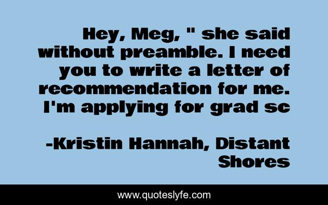 This page presents the quote "Hey, Meg, " she said without preamble. I need you to write a letter of recommendation for me. I'm applying for grad sc". Author of this quote is Kristin Hannah, Distant Shores. This quote is about application, art, friends, reccomendation,.
