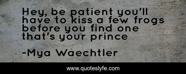 This page presents the quote "Hey, be patient you'll have to kiss a few frogs before you find one that's your prince". Author of this quote is Mya Waechtler. This quote is about fairy-tales, love, affection, patience,.