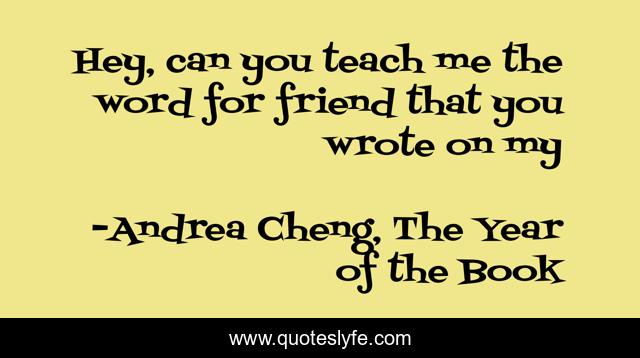 This page presents the quote "Hey, can you teach me the word for friend that you wrote on my". Author of this quote is Andrea Cheng, The Year of the Book. .