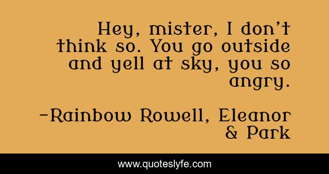 This page presents the quote "Hey, mister, I don’t think so. You go outside and yell at sky, you so angry.". Author of this quote is Rainbow Rowell, Eleanor & Park. This quote is about inspirational-attitude, humor,.